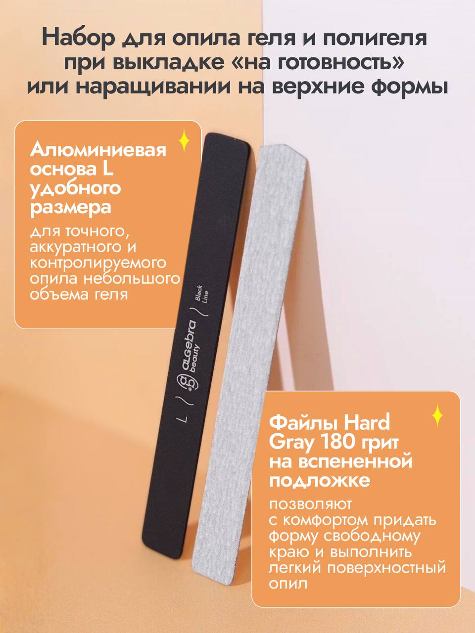 В набор входят черная алюминиевая основа L и файлы на вспененной основе HARD GRAY 180 грит.