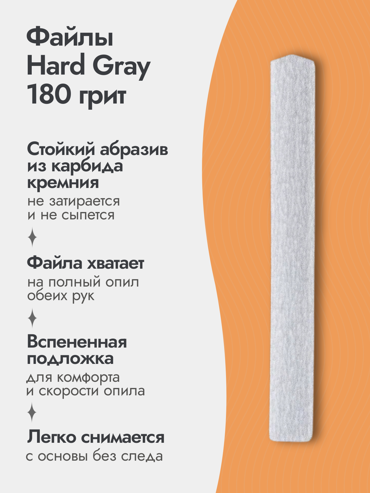 Линейка файлов HARD GRAY обожаема мастерами, потому что идеально подходит для опила искусственных материалов. Файлы 180 грит не осыпаются и не забиваются во время опила. Острые абразивные частицы легко спиливают материал без нажима. Файлы имеют вспененную подложку, которая повышает комфортность в работе и гасит вибрацию в процессе опила. Подложка легко подстраивается по форме ногтя и позволяет опилить больший объем материала, что помогает ускориться.