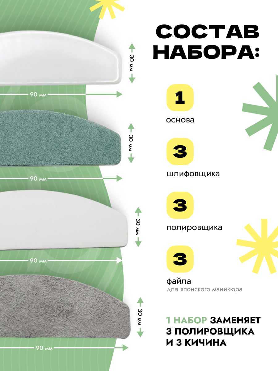 Состав набора: пластиковая основа, 3 файла-шлифовщика, 3 файла-полировщика, 3 файла - замшевых полировщика.