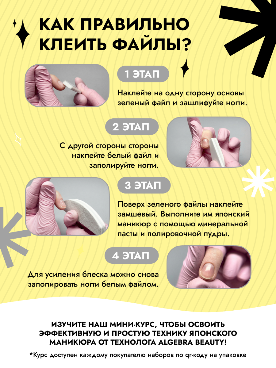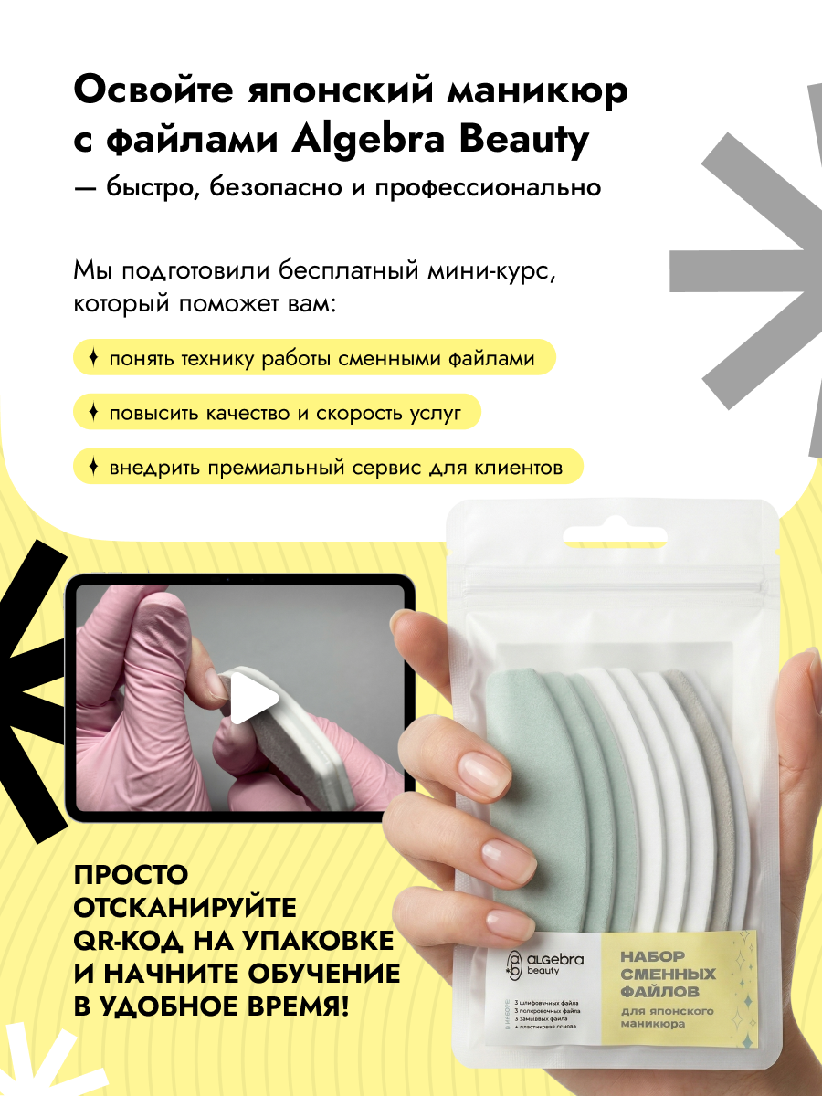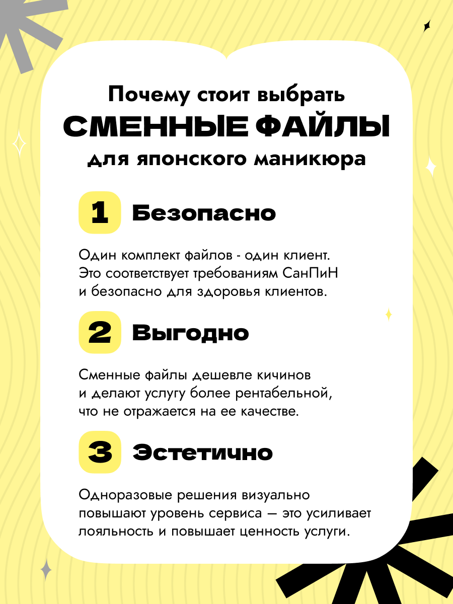 Система сменных файлов делает услугу: удобной в работе, безопасной и гигиеничной, соответствующей требованиям СанПиН и экономически выгодной для мастера.Файлы универсальны и совместимы с пастами и пудрами разных производителей.
