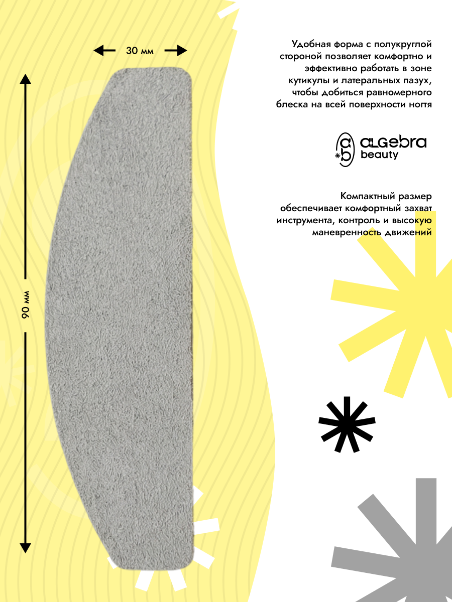 Вспененная основа создаёт лёгкую амортизацию и позволяет равномерно распределять усилие при полировке, что помогает добиться стабильного зеркального эффекта.Форма «мини-лодка» удобна в работе и обеспечивает точность движений даже в зоне у кутикулы.