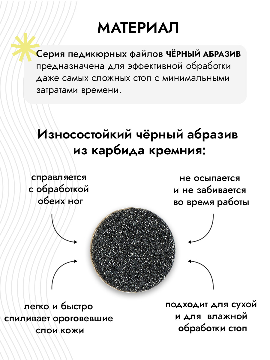 Качественный чёрный абразив из карбида кремния легко и быстро спиливает ороговевшие слои кожи, не осыпается и не забивается во время работы. Подходит для сухой и для влажной обработки стоп. За счёт качественного клеевого состава файлы легко и надёжно фиксируются на основе, не слетают во время работы, а после процедуры легко снимаются, не оставляя следов клея.