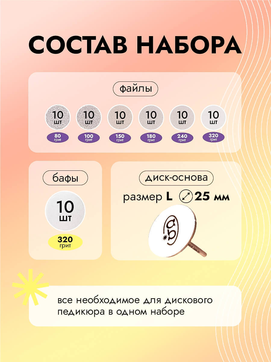В наборе есть диск-основа, 6 видов абразива файлов и бафы: 80 и 100 грит мы советуем использовать на очень грубой коже и при раскрытии трещин, 150 и 180 грит при средней грубости стопы, 240 и 320 грит для шлифовки и полировки стопы, файлы-бафы для финишной шлифовки в конце процедуры.