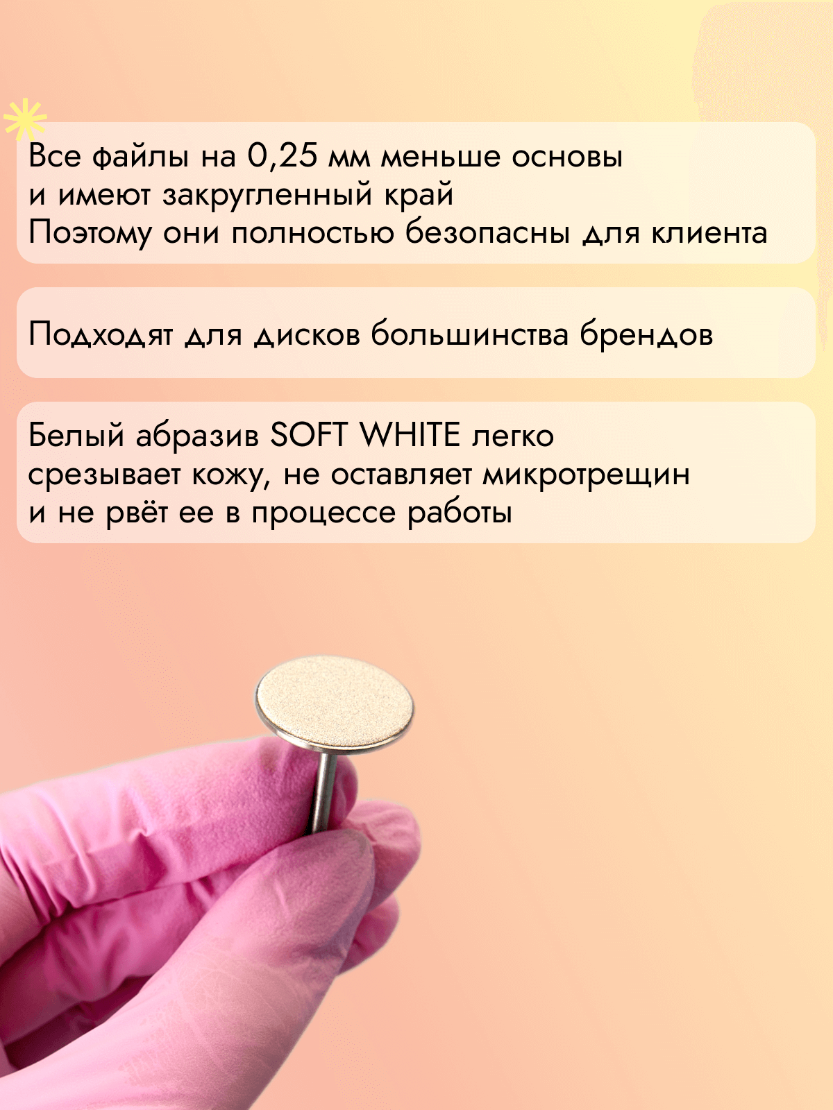 Благодаря качественному абразиву файлы диски упрощают работу мастера, не слетают с диска. Они не забиваются и не осыпаются во время работы. Качественный и прочный клеевой слой, который потом легко снимается и не оставляет следов. Белый абразив файлов SOFT WHITE легко срезает кожу, не оставляет микротрещин и не рвет ее в процессе работы, а деликатный абразив бафов мягко и бережно шлифует кожу.