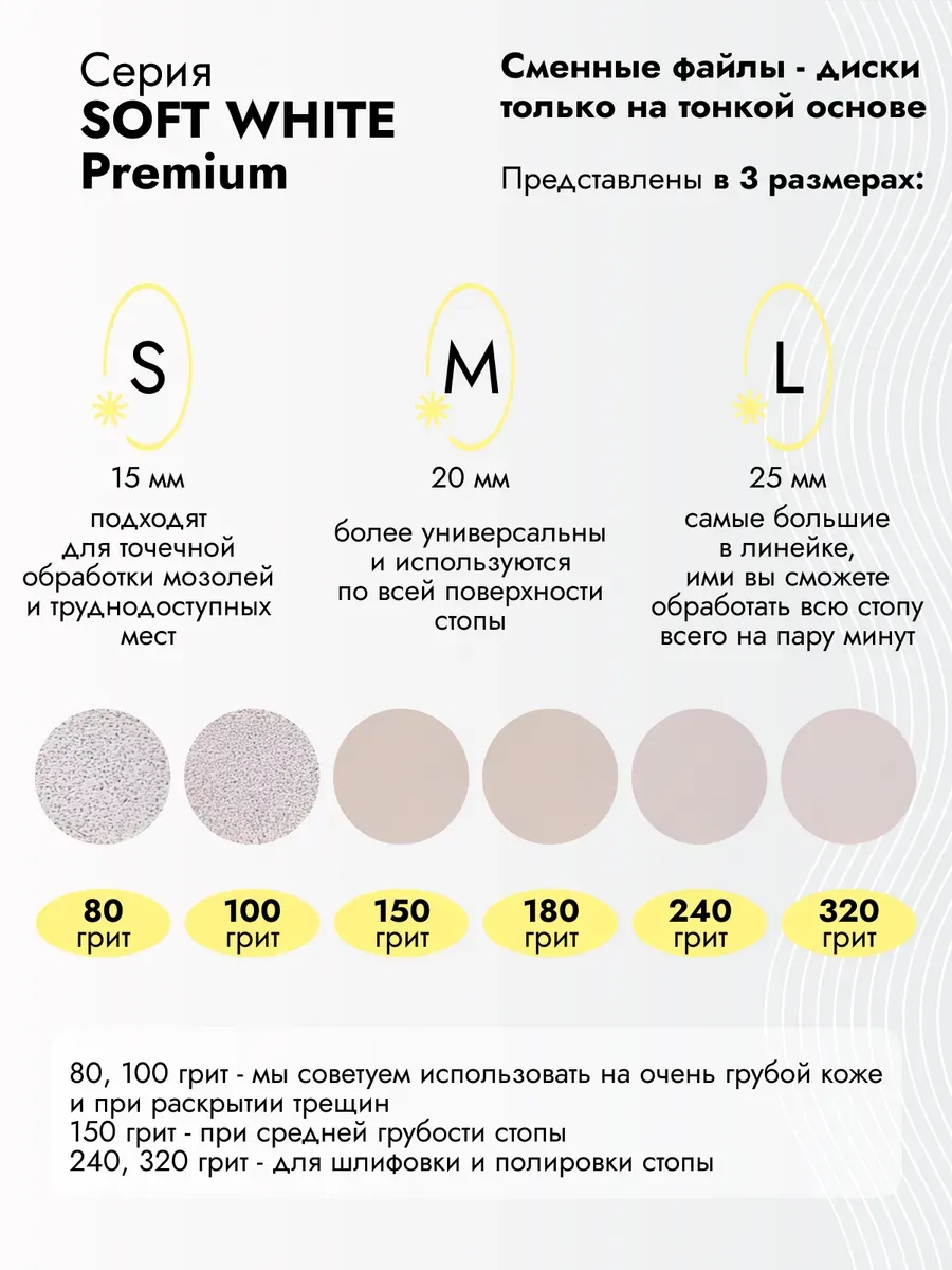 Благодаря качественному абразиву файлы диски упрощают работу мастера, не слетают с диска. Они не забиваются и не осыпаются во время работы. Качественный и прочный клеевой слой, который потом легко снимается и не оставляет следов. Белый абразив файлов SOFT WHITE легко срезает кожу, не оставляет микротрещин и не рвет ее в процессе работы, а деликатный абразив бафов мягко и бережно шлифует кожу.