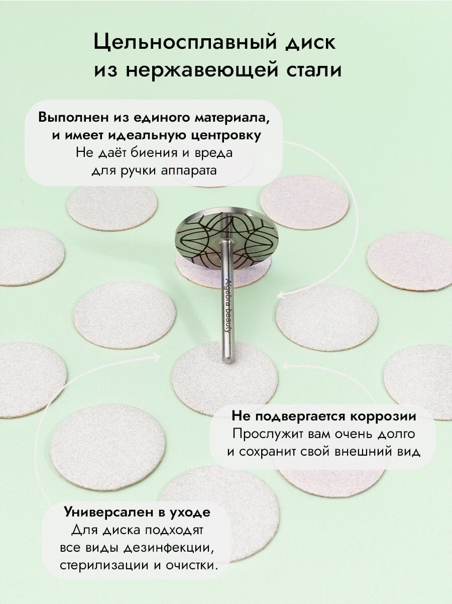 Перед использованием обработайте диск согласно правилам СанПиН, обезжирьте рабочую поверхность. Закрепите на диске сменный файл от Algebra Beauty, хорошо прижав его пальцами к основе на 3-4 секунды. После использования снимите и утилизируйте файл.