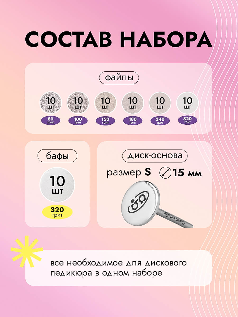 В наборе есть диск-основа, 6 видов абразива файлов и бафы: 80 и 100 грит мы советуем использовать на очень грубой коже и при раскрытии трещин, 150 и 180 грит при средней грубости стопы, 240 и 320 грит для шлифовки и полировки стопы, файлы-бафы для финишной шлифовки в конце процедуры.