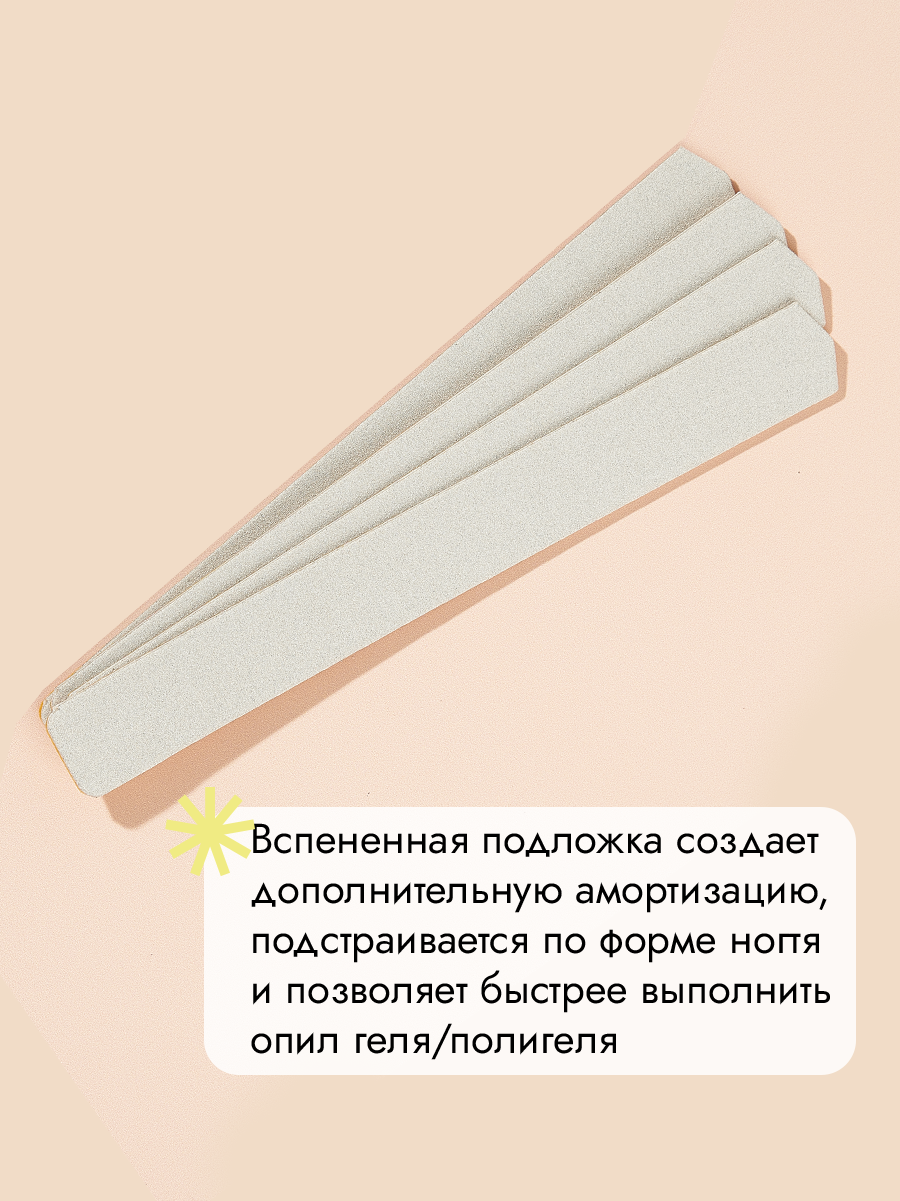 Линейка SOFT WHITE идеально подходит для опила натуральных ногтей, а также плавного опила искусственных материалов. Файлы не осыпаются и не забиваются во время опила, поэтому их хватает на все время процедуры. Округлые абразивные частицы спиливают материал мягко и комфортно даже для высокочувствительных клиентов. Все файлы данной линейки имеют вспененную подложку, которая повышает комфортность в работе и гасит вибрацию в процессе опила. Подложка легко подстраивается по форме ногтя и позволяет быстрее опилить больший объем материала.