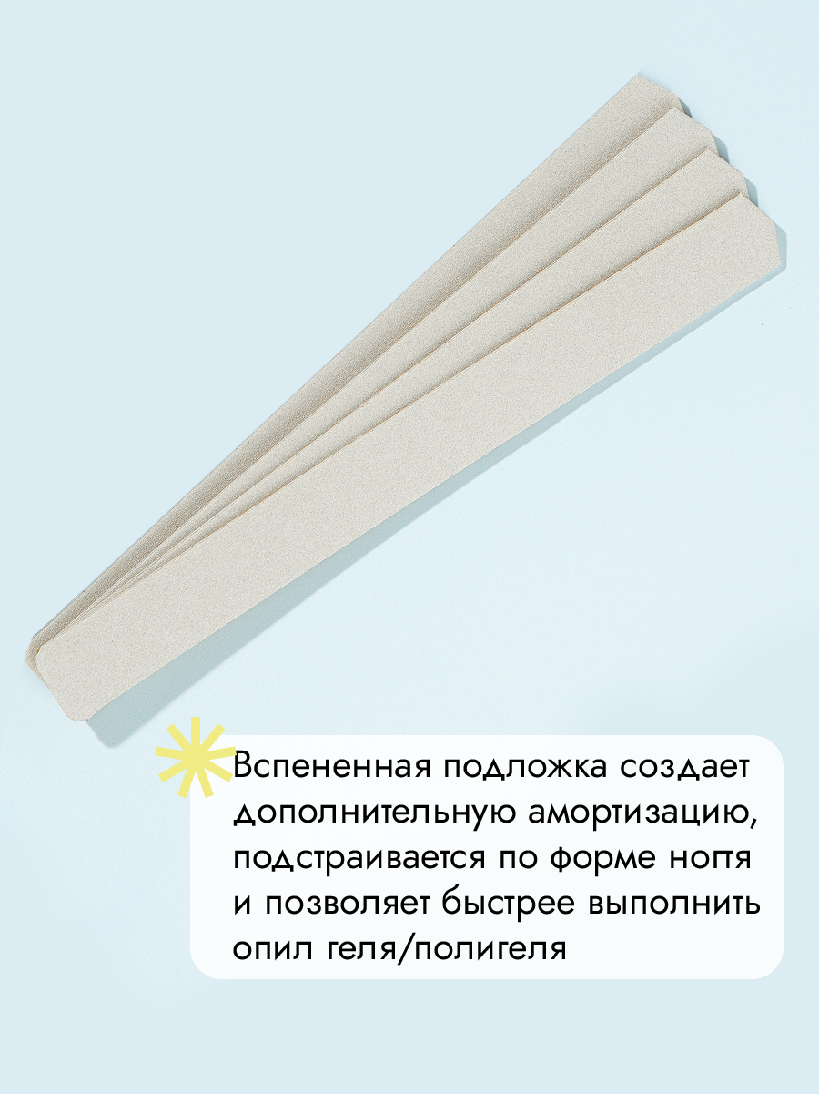 Линейка SOFT WHITE идеально подходит для опила натуральных ногтей, а также плавного опила искусственных материалов. Файлы не осыпаются и не забиваются во время опила, поэтому их хватает на все время процедуры. Округлые абразивные частицы спиливают материал мягко и комфортно даже для высокочувствительных клиентов. Все файлы данной линейки имеют вспененную подложку, которая  повышает комфортность в работе и гасит вибрацию в процессе опила. Подложка легко подстраивается по форме ногтя и позволяет быстрее опилить больший объем материала.