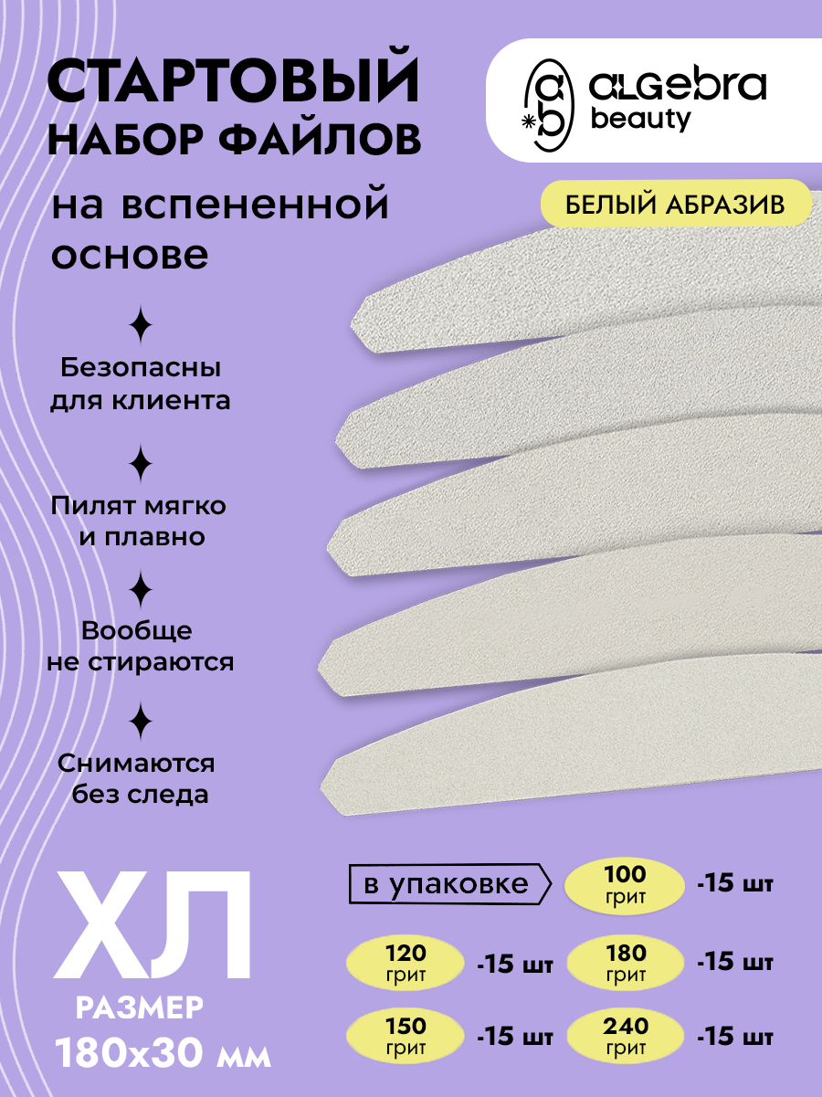 В набор входят белые файлы на вспененной основе 5 видов: 100грит - 15 штук, 120грит - 15 штук, 150грит - 15 штук, 180грит - 15 штук, 240грит - 15 штук.